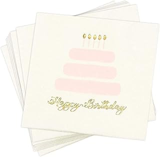 (Happy Birthday) - 50-Pack Cocktail Napkins - Disposable Paper Party Napkins with Happy Birthday Printed in Gold Foil and Pink Cake, Perfect for Girls or Princess Birthday Celebrations, 13cm x 13cm Folded