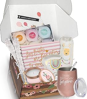 Happy Birthday Gift for Women: Stainless Steel Tumbler, Bath Bomb Set, Scented Candle, Wine Stopper, Champagne Bottle, Candy Box for Her