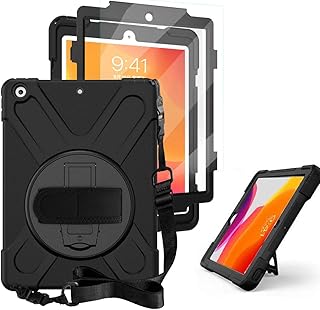 iPad 9世代 8世代 ケース iPad 7世代 ケース iPad 10.2 ケース 2021/2019/2020 保護フィルム SIBEITU 耐衝撃 衝撃吸収 スタンド ハンドストラップ 肩掛けー ショルダーストラップ 回転 頑丈 傷つけ防止 仕事用 防塵 ハード 子供 キッズ アイパッド 第七世代 10.2 カバー A2200 A2198 A2197 ブラック