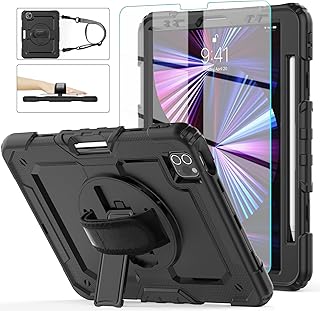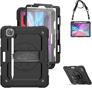 iPad Air 4 ケース 10.9インチ iPad Pro 11ケース 2020 & 2018 [子供プルーフ] アンビソン フルボディ保護ケース 9H強化ガラススクリーンプロテクター付き 回転式キックスタンド&ハンドストラップ ショルダーストラップ(ブラック)